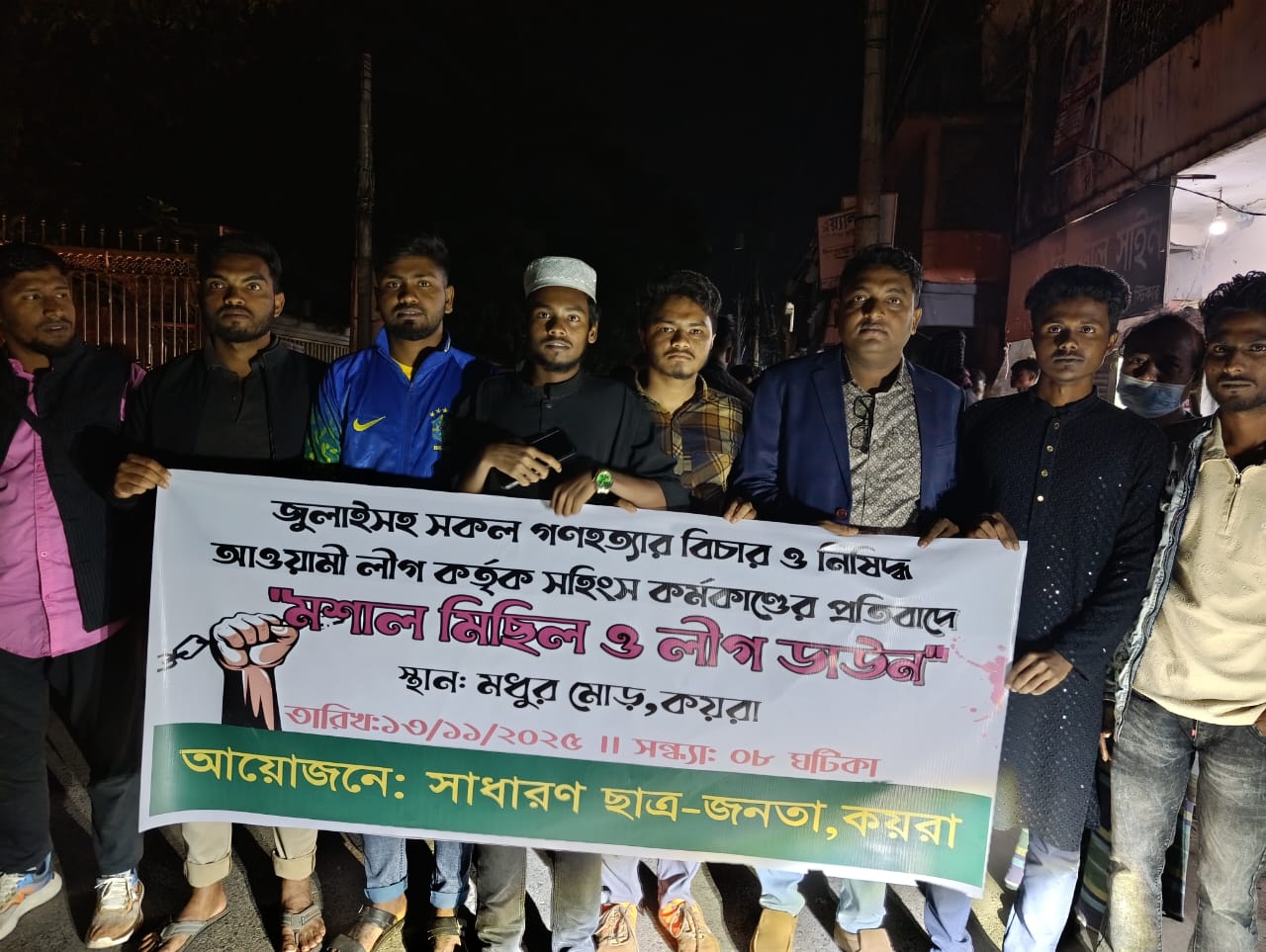 খুলনার কয়রা উপজেলায় জুলাইসহ সকল গণহত্যার বিচার ও আওয়ামীলীগ কতৃক সহিংস কর্মকাণ্ডের প্রতিবাদে সাধারণ জনতার ব্যানারে মশাল ও লীগ ডাউন কর্মসূচি পালিত হয়েছে।